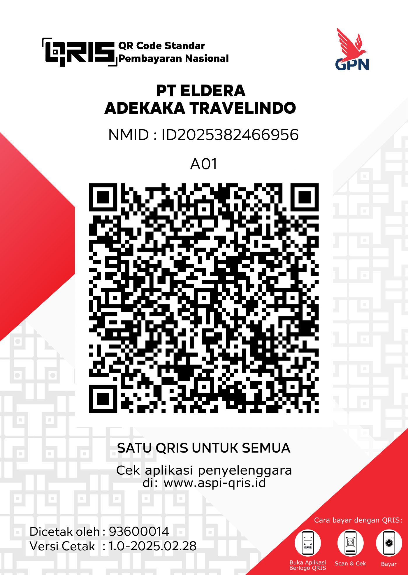 Mulai dari pembayaran melalui jaringan ATM (Bank Mandiri, BNI, BRI, BCA). Selain itu, kini Sobat juga dapat membayar pesanan melalui QRis Eldera Adekaka Travelindo. Yuk, pilih metode cara bayar yang diinginkan dan ikuti langkah-langkah yang tersedia.